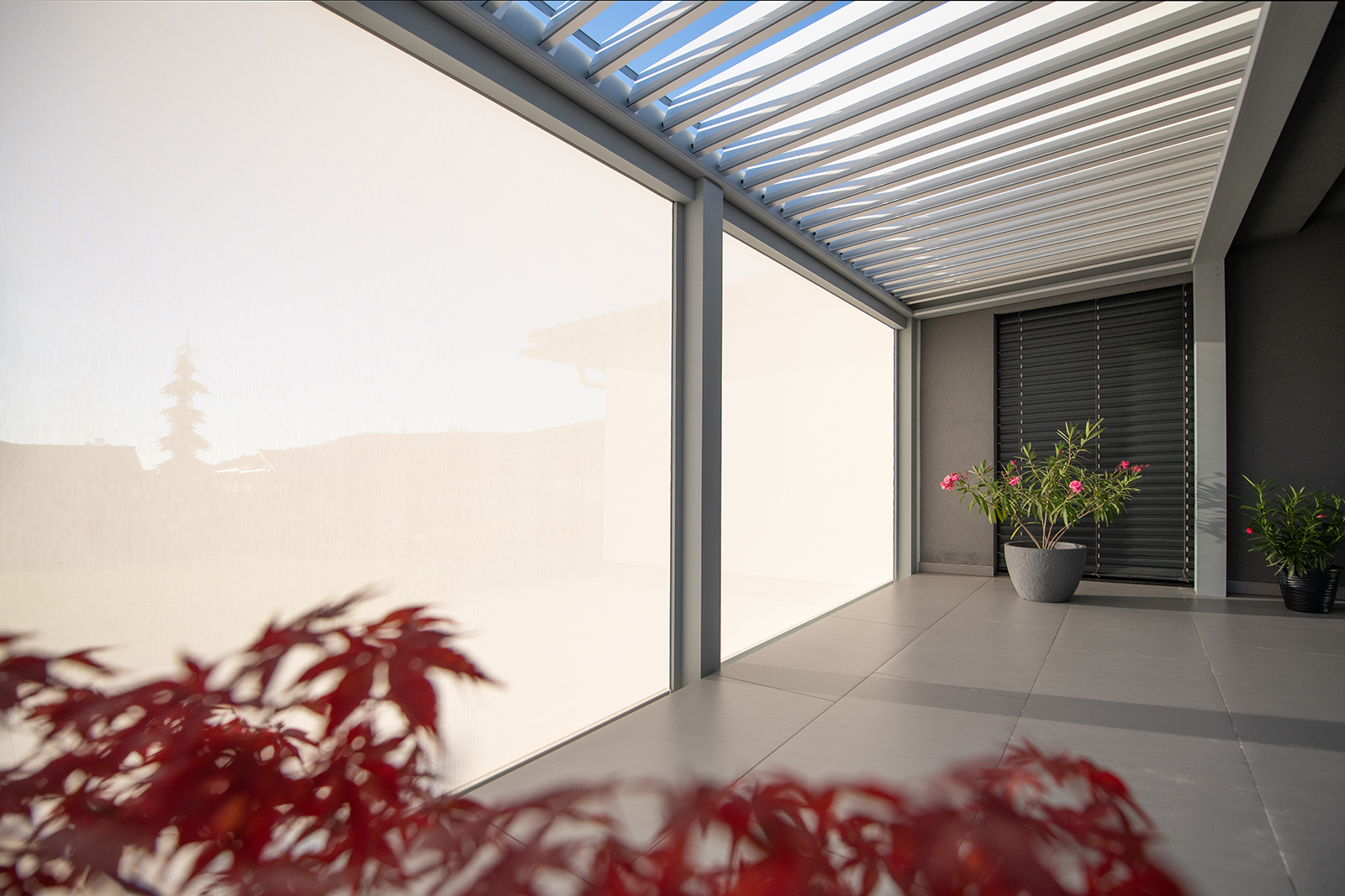 Pergola s pootevřenými lamelami a staženými bočními screenovými clonami na terase