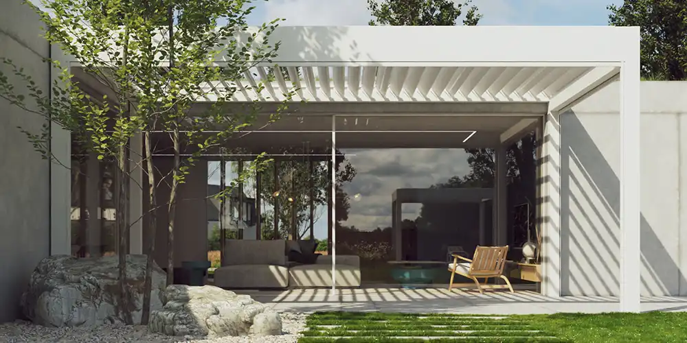 Pergola s pootevřenými lamelami a staženými bočními screenovými clonami na terase