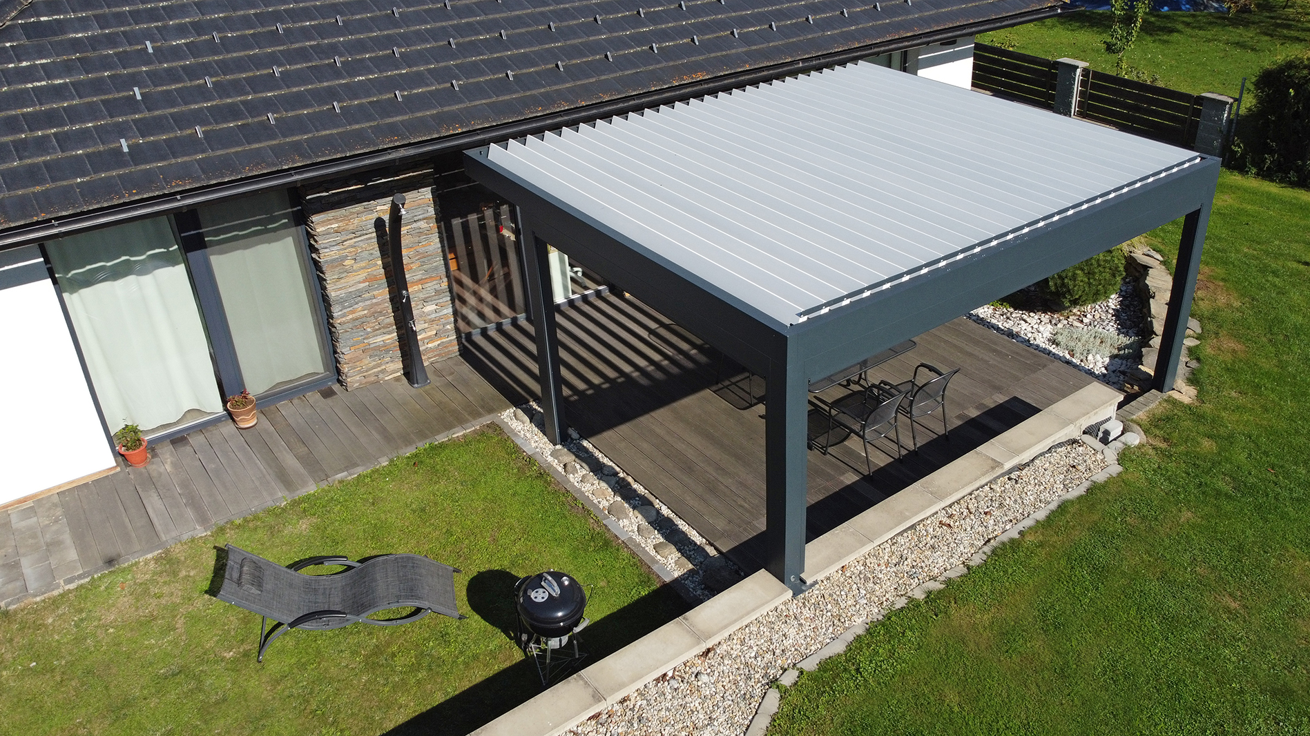 Bioklimatická pergola Lamelino zaisťuje odvetrávanie horúceho vzduchu zo svojho priestoru pomocou naklápacích strešných lamiel. Cirkulácia vzduchu vám zaistí pohodlné posedenie vonku aj počas horúcich dní.