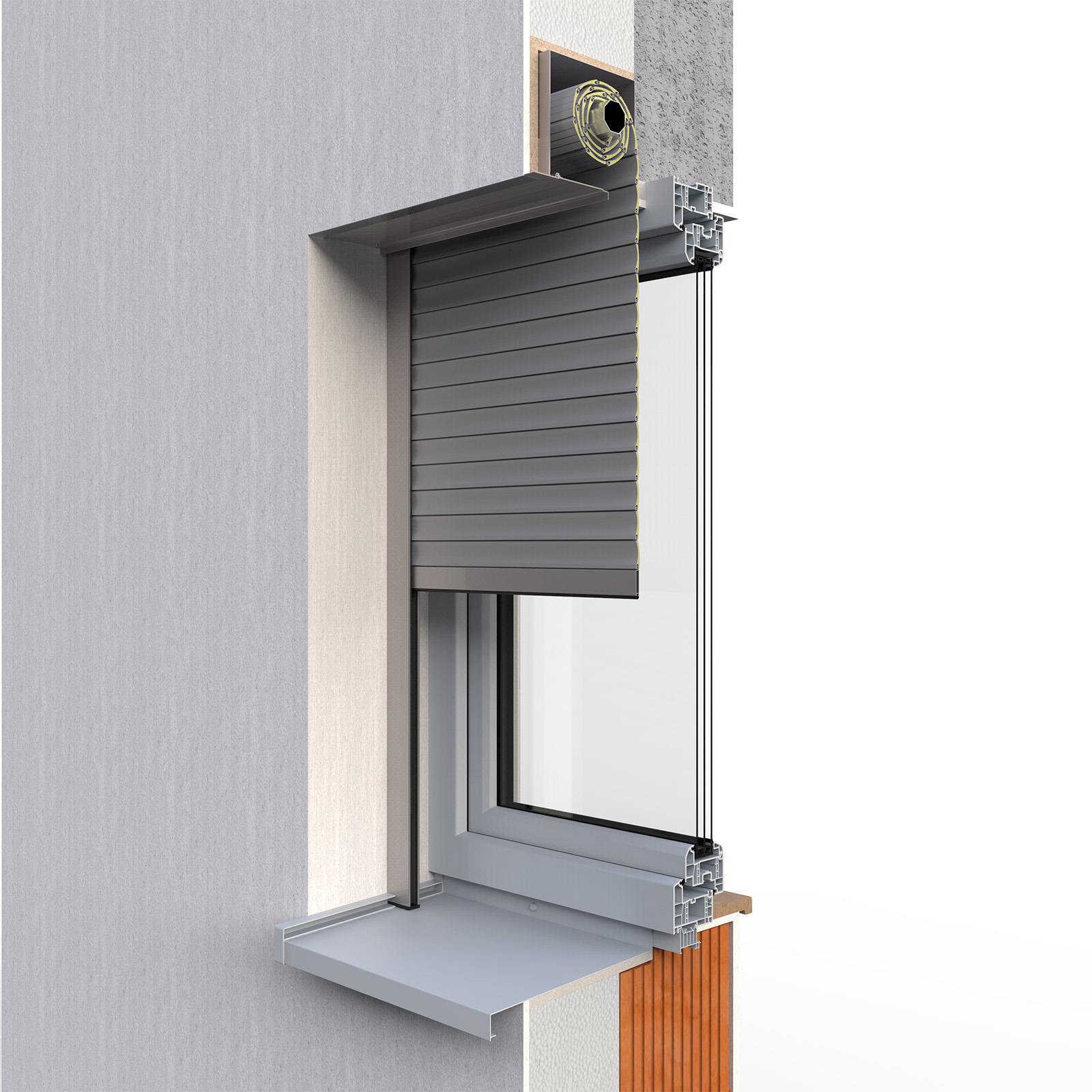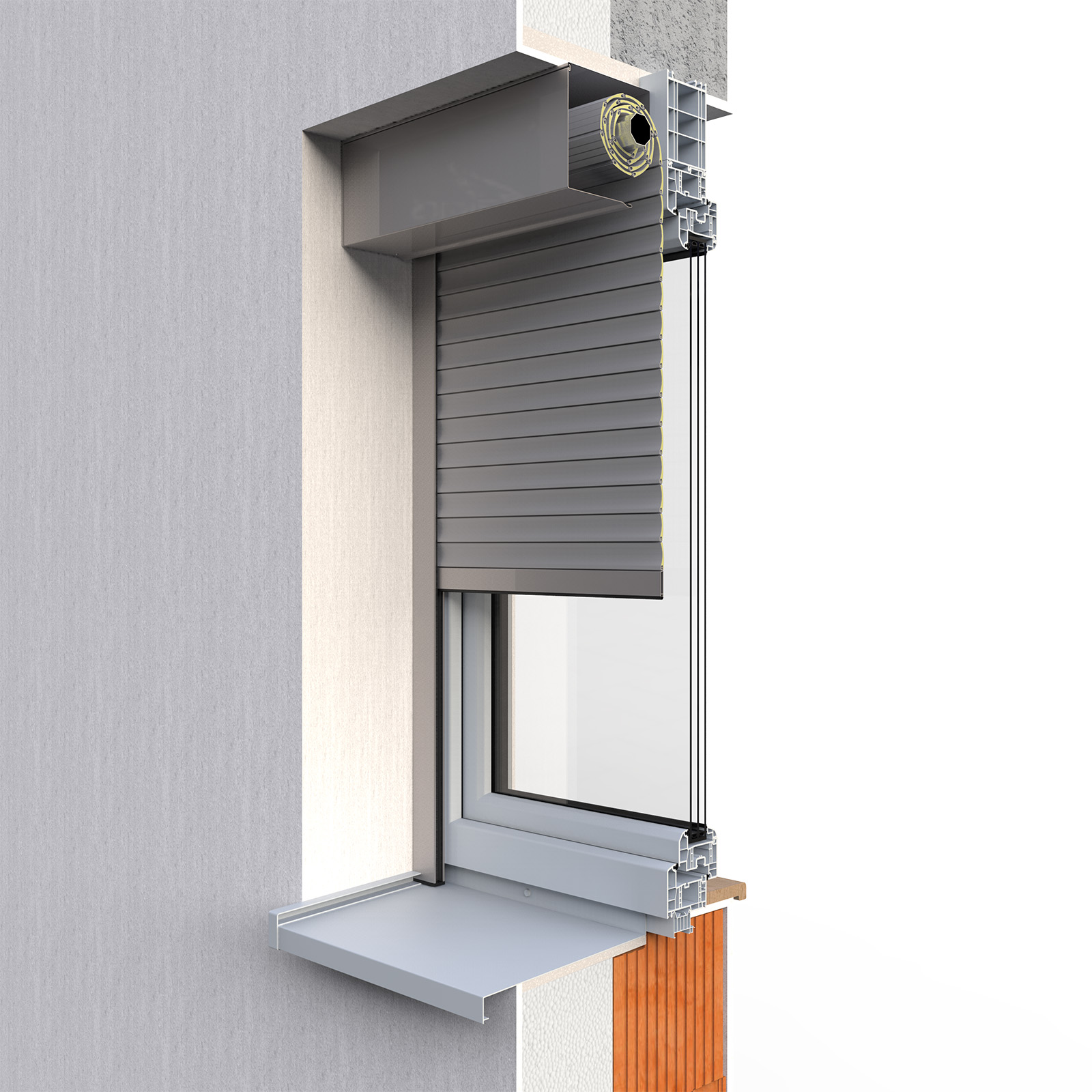 Návin lamiel vonkajšej hliníkovej rolety je skrytý v podomietkovom boxe, ktorý sa inštaluje priamo na murivo, vyrovná sa zatepľovacími panelmi a potom zaomietne. Toto elegantné a čisté riešenie je ideálne pre novostavby aj rekonštrukcie.
