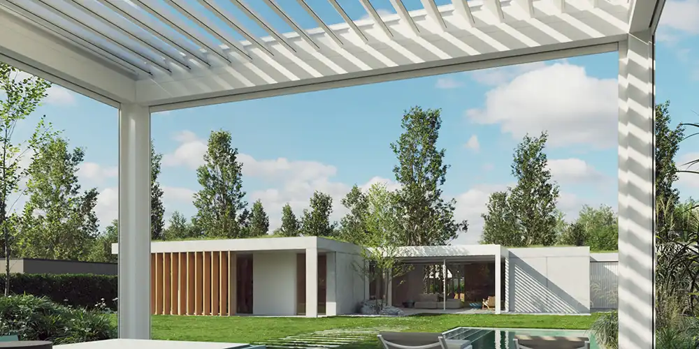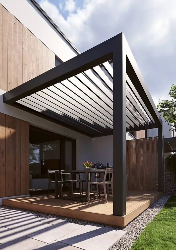Pergola s pootevřenými lamelami a staženými bočními screenovými clonami na terase